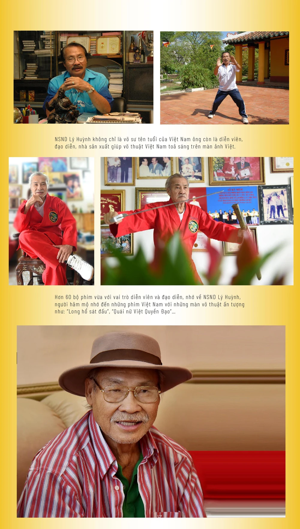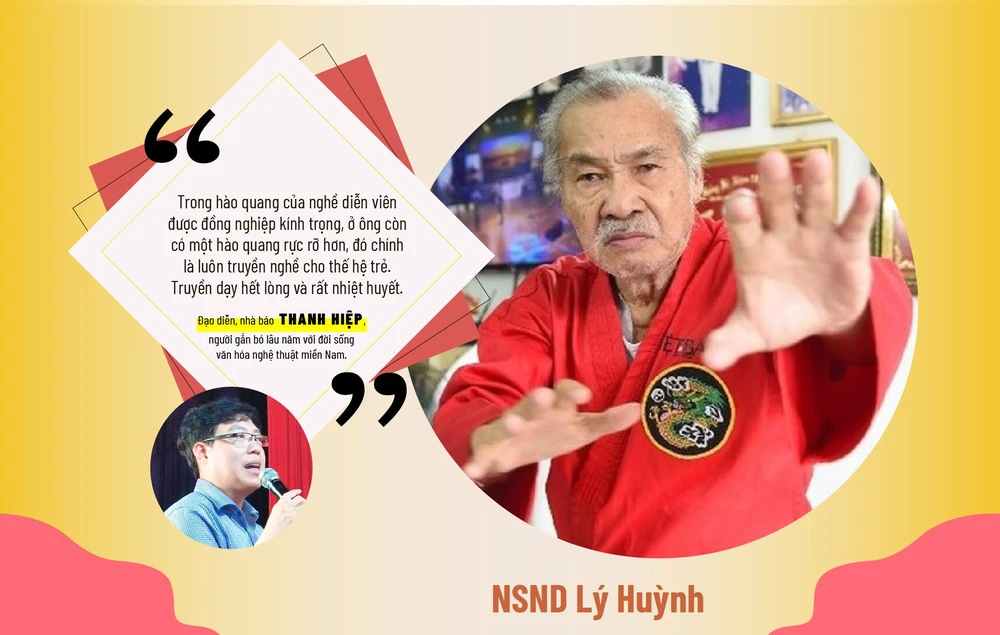 Đạo diễn Thanh Hiệp chia sẻ, những đóng góp của cố nghệ sĩ đối với điện ảnh nước nhà đã được giới chuyên môn, bình luận về điện ảnh và công chúng ghi nhận qua nhiều vai diễn, tác phẩm điện ảnh in sâu trong lòng người mộ điệu. NSND Lý Huỳnh nổi tiếng với chiêu "Liên hoàn bát cước", giải nghĩa theo giới võ thuật là tuyệt chiêu “tung người đá 8 cước trên không”.