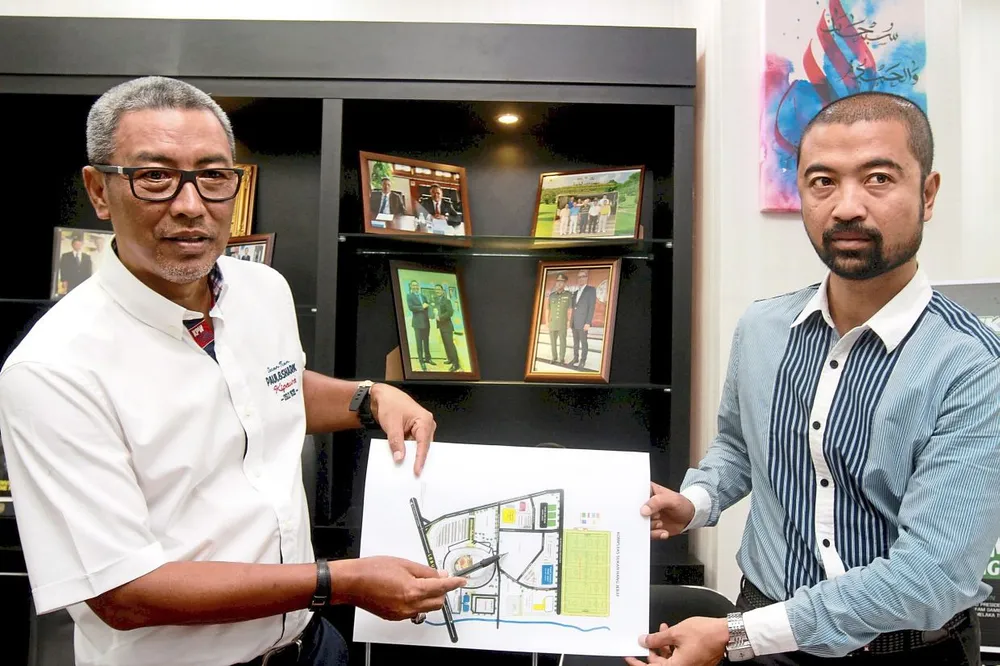Phó Chủ tịch FAM Yusoff (trái) nêu các sơ đồ trận bóng có thể tiến hành trong điều kiện cách ly.