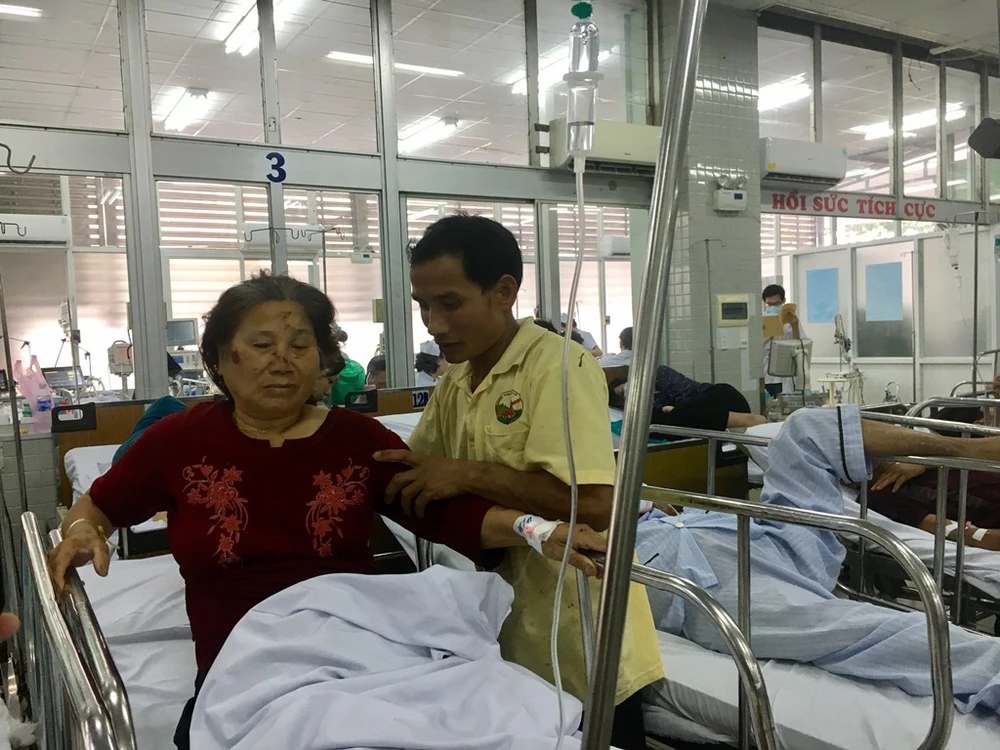 Bà Đoàn Thị Loan (67 tuổi, ngụ Bình Phước) bị gãy chân phải, theo dõi chấn thương đầu nhập Khoa cấp cứu BV Chợ Rẫy do bị một người có biểu hiện say rượu tông phải khi đang tập thể dục vào sáng 15-11. Ảnh: HL