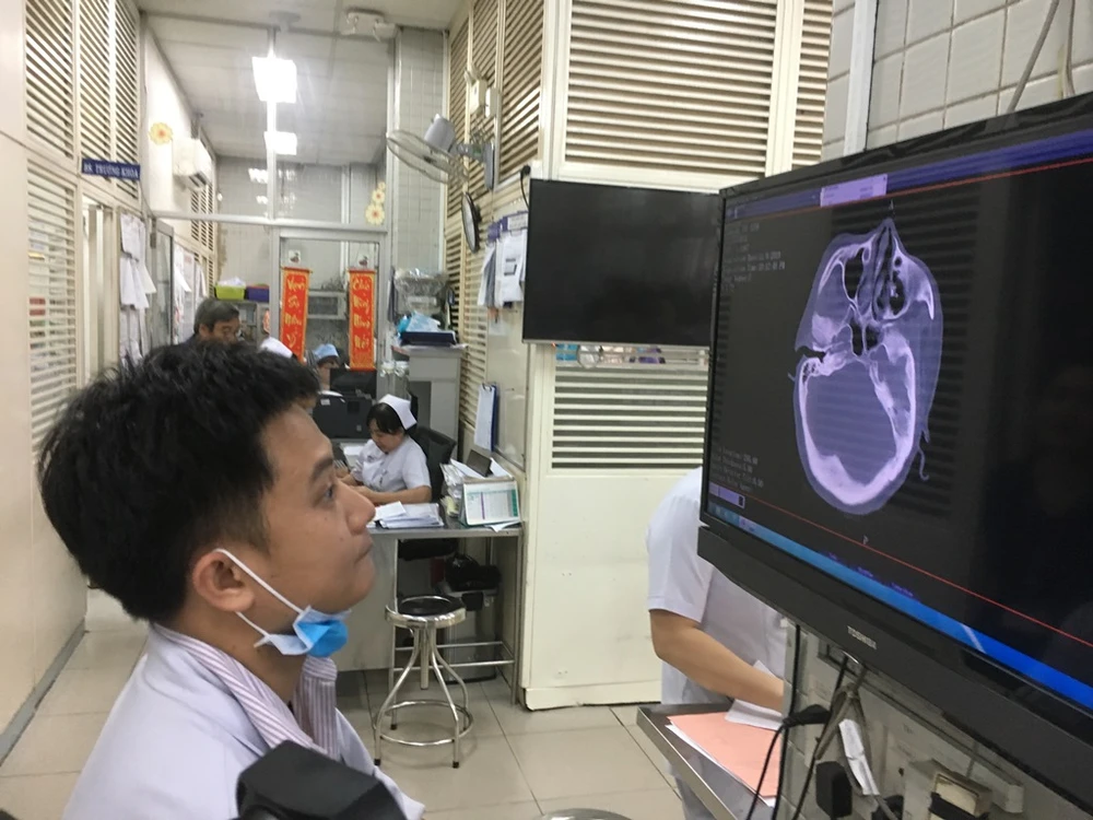 Bác sĩ Hưng đang đọc hình ảnh một ca nghi tổn thương não tại Khoa cấp cứu. Ảnh: HL