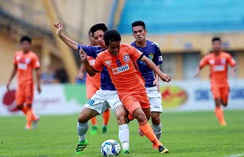 SHB Đà Nẵng chạy trước, Hà Nội T&T chạy sau. Hai “anh em” trong nhà bầu Hiển cùng trong nhóm đua vô địch với Hải Phòng, Than Quảng Ninh và Thanh Hóa. Ảnh: QUANG THẮNG