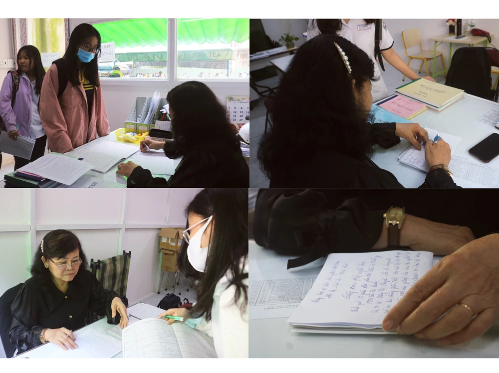 11 giờ trưa, phòng giám thị trở nên nhộn nhịp vì học sinh các lớp xuống nộp sổ đầu bài. “Má trị ơi”, con nộp sổ nhé”, tiếng học trò vang lên.