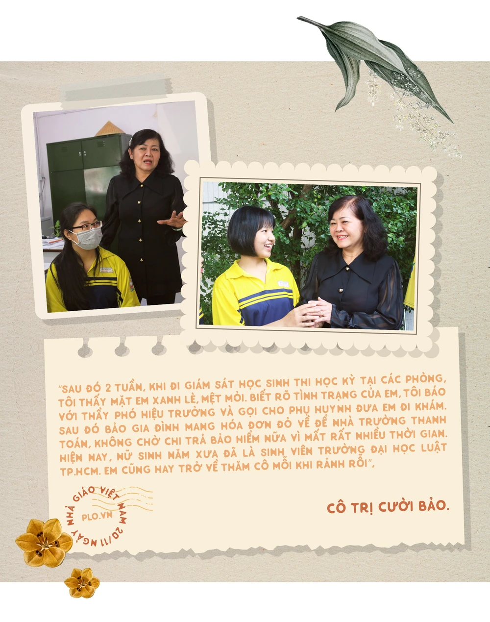 Cô nhớ lại, cách đây 3 năm có một phụ huynh vào đưa giấy xin phép cho con nghỉ học. Qua ăn mặc có thể thấy đó là một người lao động vất vả. Sau một hồi dò hỏi, cô biết nữ sinh bị bệnh tuyến giáp, phải nghỉ học nhiều lần. Điều đáng nói, em chỉ được khám ở phường do nhà không có tiền mua bảo hiểm. Không suy nghĩ, cô rút ra 500.000 đồng đưa phụ huynh, bảo họ ra phường mua bảo hiểm để nhanh chóng đưa con đi khám.