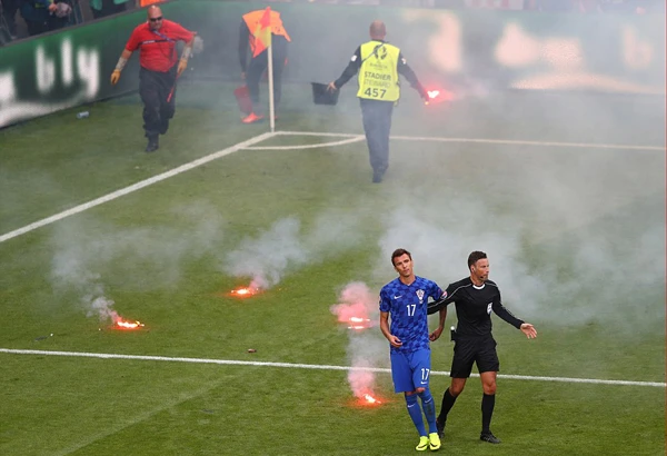 Số 17 Mandzukic cũng suýt nữa bị một quả pháo trúng người, trọng tài phải yêu cầu anh ra khu vực an toàn