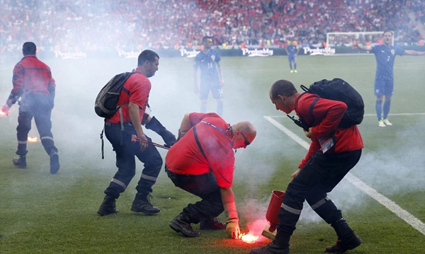 Các nhân viên trên sân phải dập tắt và dọn dẹp những quả pháo để trận đấu được tiếp tục