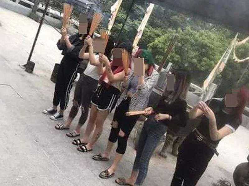 Các cô gái ăn mặc phản cảm khi đi chùa bị phản ứng. Ảnh: Internet