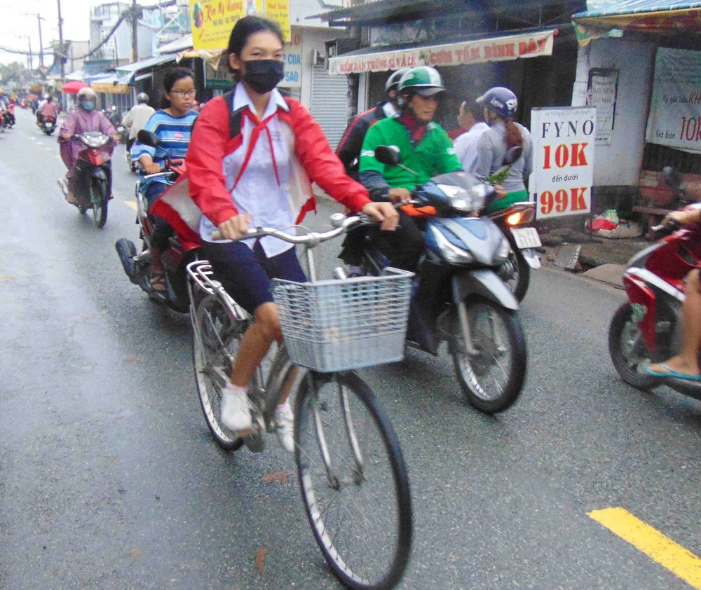 Trong khi bạn bè ở nhà, em Mai lại đạp xe tới trường. Ảnh: TRẦN NGỌC