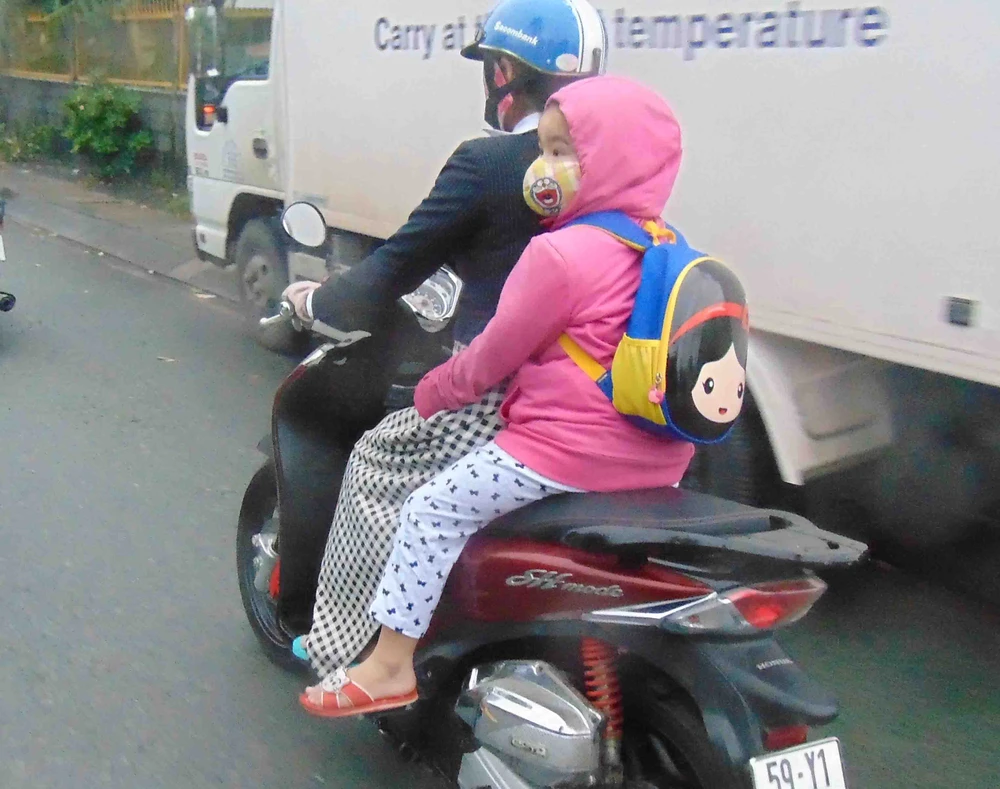 Trên tuyến đường Quang Trung (quận Gò Vấp, TP.HCM), chúng tôi cũng bắt gặp một chị chở con ngồi sau. Cả hai mẹ con mặc áo khoác, mang khẩu trang để chống lạnh.