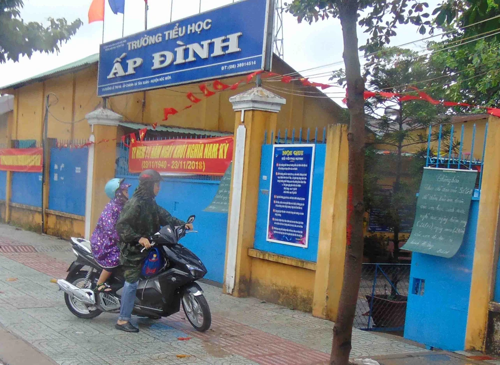 Sáng 26-11, bão đã ngưng nhưng trời còn mưa lâm râm. Anh Thành (huyện Hóc Môn, TP.HCM) chở con tới Trường Tiểu học Ấp Đình (xã Tân Xuân, huyện Hóc Môn) và ngạc nhiên thấy sân trường trống trơn.