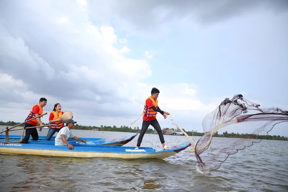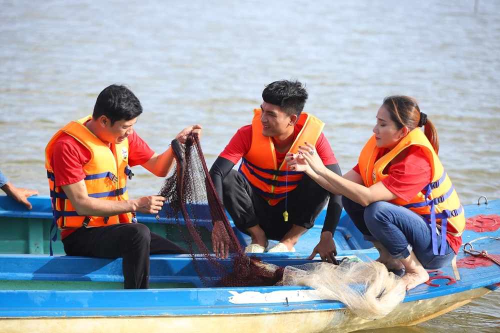 Sau khi tạm ấm bụng, Tiết Cương lại dẫn cả nhóm tới đầm Thị Tường – một địa điểm nổi tiếng của Cà Mau. Ở đây, họ được người dân bản địa hướng dẫn cách quăng lưới đánh cá.