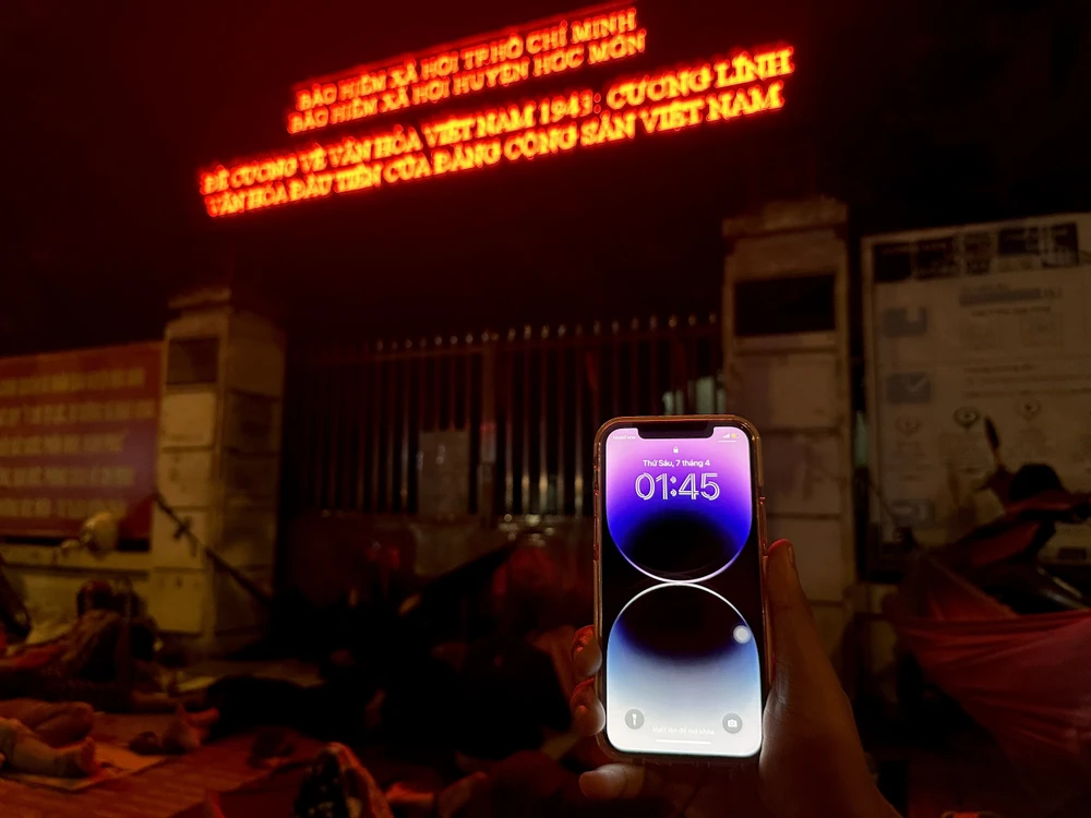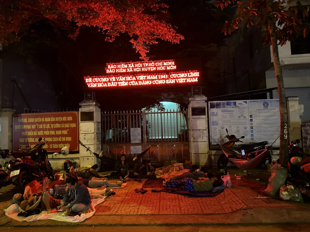 Hai vợ chồng chị Thạch Hồng Anh và anh Nguyễn Chí Hiếu đến trước cổng cơ quan Bảo hiểm xã hội huyện Hóc Môn lúc 19 giờ. Cả hai thay phiên nhau ngả lưng trên một chiếc võng, người kia ngủ trên võng thì người còn lại ngả lưng tạm dưới tấm bạt trải trên vỉa hè.