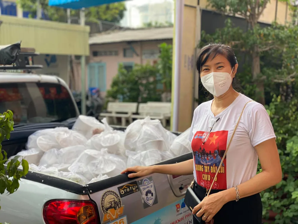 Vì sức khoẻ chưa ổn định nên cô phụ trách công việc hậu cần là phân chia từng phần thức ăn, nhóm tình nguyện viên khác sẽ giao tới bệnh viện. Cô và các tình nguyện viên phụ trách công việc này đều mang khẩu trang, găng tay đầy đủ. Công việc nhẹ nhàng nên không cần mang đồ bảo hộ.