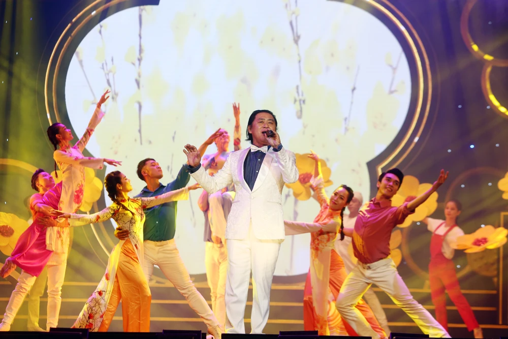NSND Tạ Minh Tâm thể hiện ca khúc Mùa xuân trên quê hương mở màn lễ trao giải Mai Vàng 2021. Ảnh: NGUYỄN HÀ.