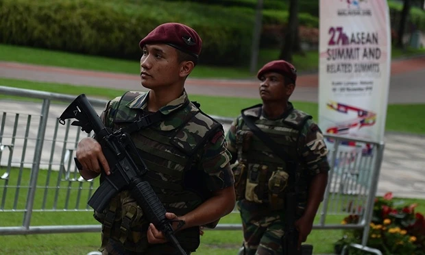 Quân đội Malaysia canh gác tại Trung tâm Hội nghị Kuala Lumpur trước thềm hội nghị thượng đỉnh ASEAN lần thứ 27 (Ảnh: AFP)