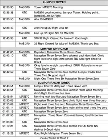 Các trao đổi bắt đầu lúc 0h25 và kết thúc vào lúc 1h19, khi máy bay được ghi nhận đạt độ cao hàng chục nghìn mét trên Biển Đông. Những lời cuối cùng phát ra từ buồng lái của MH370 là "Chúc ngủ ngon, Malaysia ba bảy không".