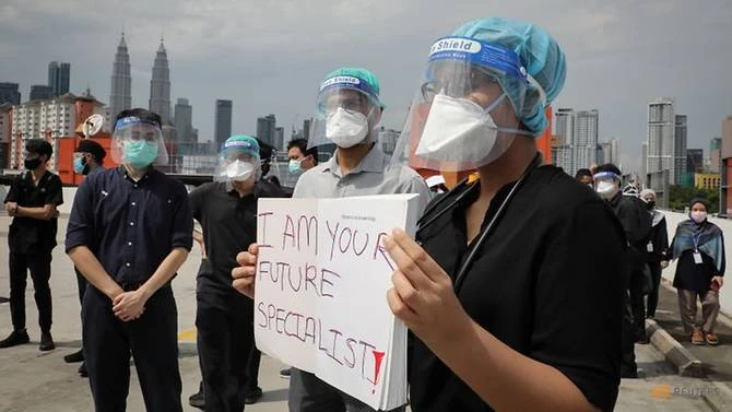 Các bác sĩ Malaysia phản đối quá tải tại Bệnh viện Kuala Lumpur vào ngày 26-7. Ảnh: REUTERS