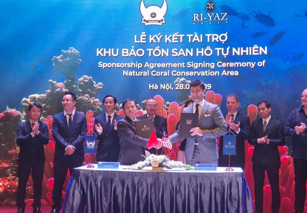 Lễ ký kết tài trợ khu bảo tồn san hô tự nhiên giữa Tập đoàn KDI Holdings Viet Nam và Ri - Tập đoàn Yaz Group Malaysia diễn ra sáng nay, 28-8.