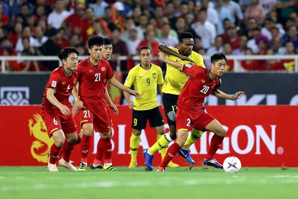 Tiền vệ nhập tịch Sumareh (phía sau Văn Đức) được đánh giá góp công lớn đưa Malaysia vào chung kết AFF Cup 2018.