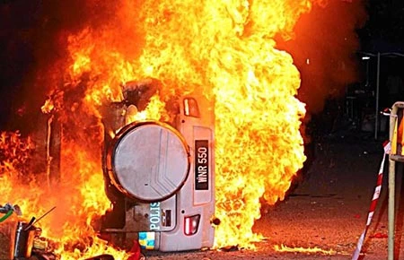 Xe cảnh sát bị lật nghiêng và đốt cháy trên đường phố bên ngoài sân vận động. Ảnh: GETTY IMAGES