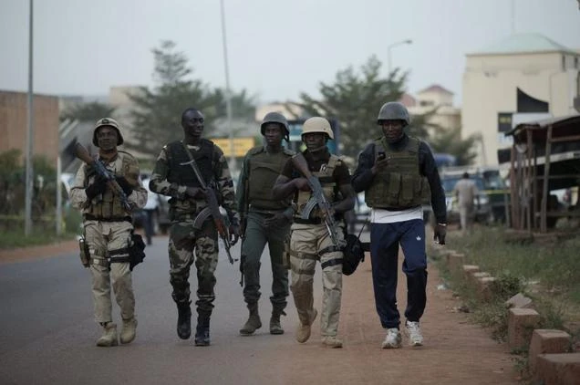 Binh sĩ Mali đi tuần quanh khách sạn Radisson Blu trong vụ tấn công khủng bố hôm 20-10 (Ảnh: Reuters)