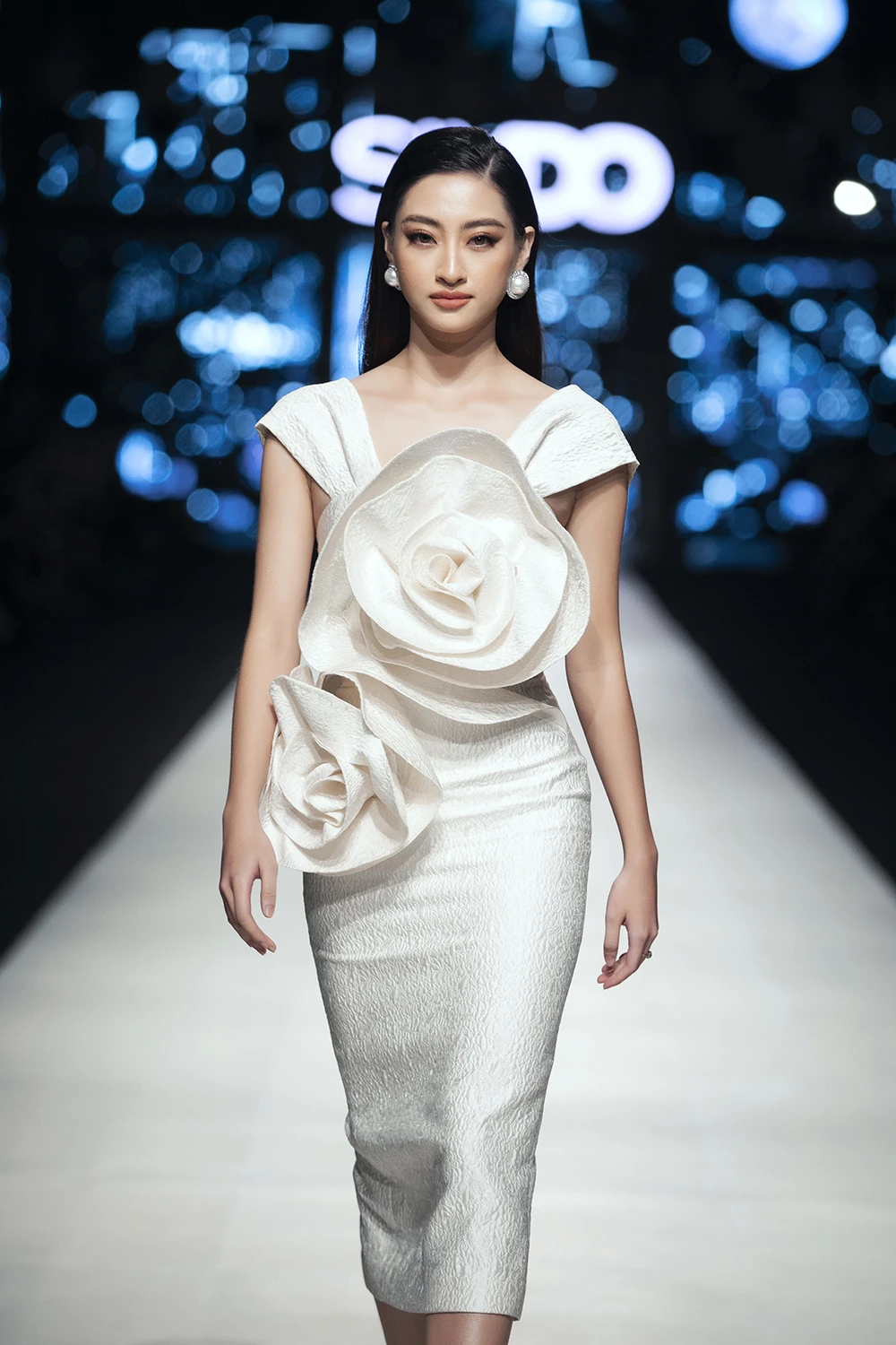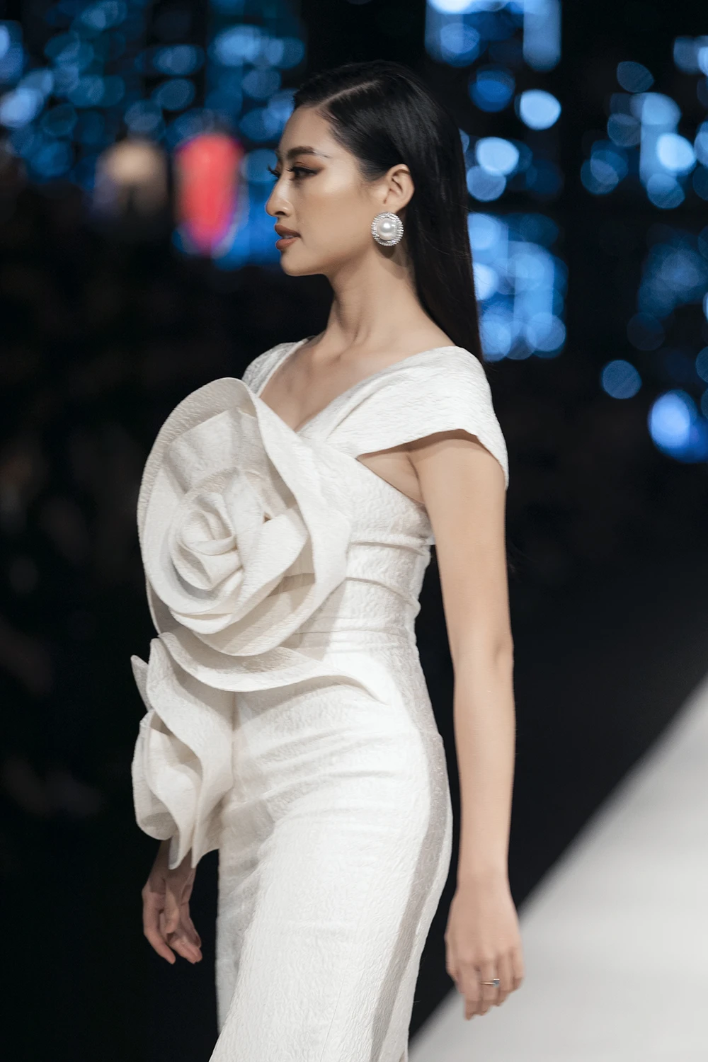Sải bước trên sân khấu dài 250m cùng nhiều siêu mẫu hàng đầu cũng không là điều gây áp lực quá lớn cho nàng hậu.