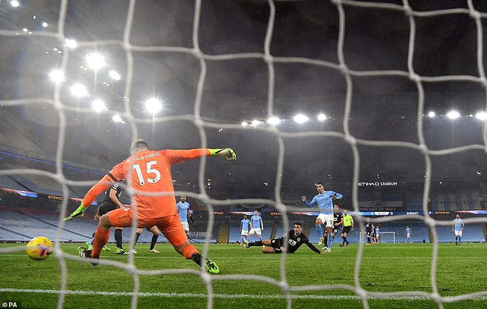 Phút 69, xuất phát từ đường chuyền dài tuyệt đẹp của De Bruyne, Phil Foden thoát xuống bên cánh trái rồi tạt vào như đặt cho Mahrez đánh đầu cận thành tung lưới Burnley ghi bàn thứ ba trong trận, đồng thời ấn định chiến thắng 5-0 cho Man City.