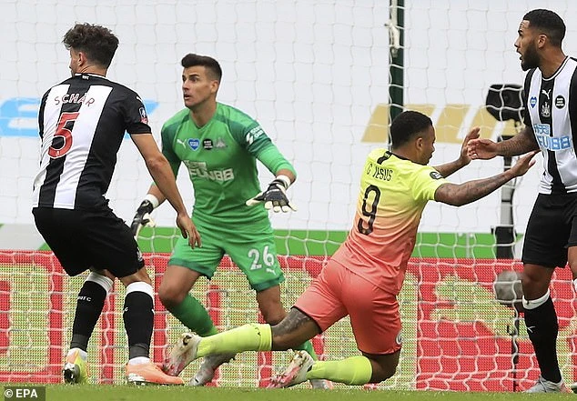 Grabiel Jesus té ngã trong vòng cấm mang về phạt đền cho Man. City. Ảnh: EPA.