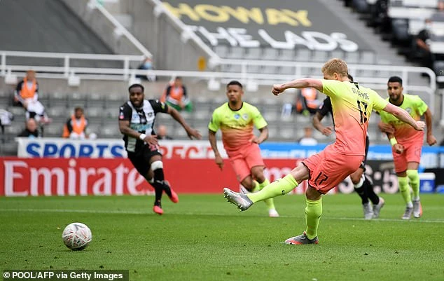 De Bruyne ghi bàn trên chấm 11 mét giúp Man. City kết thúc hiệp một với lợi thế dẫn trước 1-0. Ảnh: Getty Images.