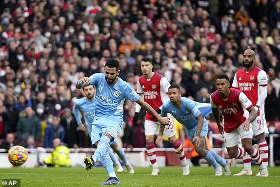 Mahrez ghi bàn gỡ hòa cho Man City trên chấm 11m. ẢNH: AP