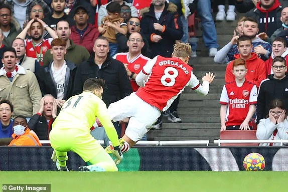 VAR xác định Ederson không phạm lỗi với Odegaard trong vòng cấm. ẢNH: GETTY