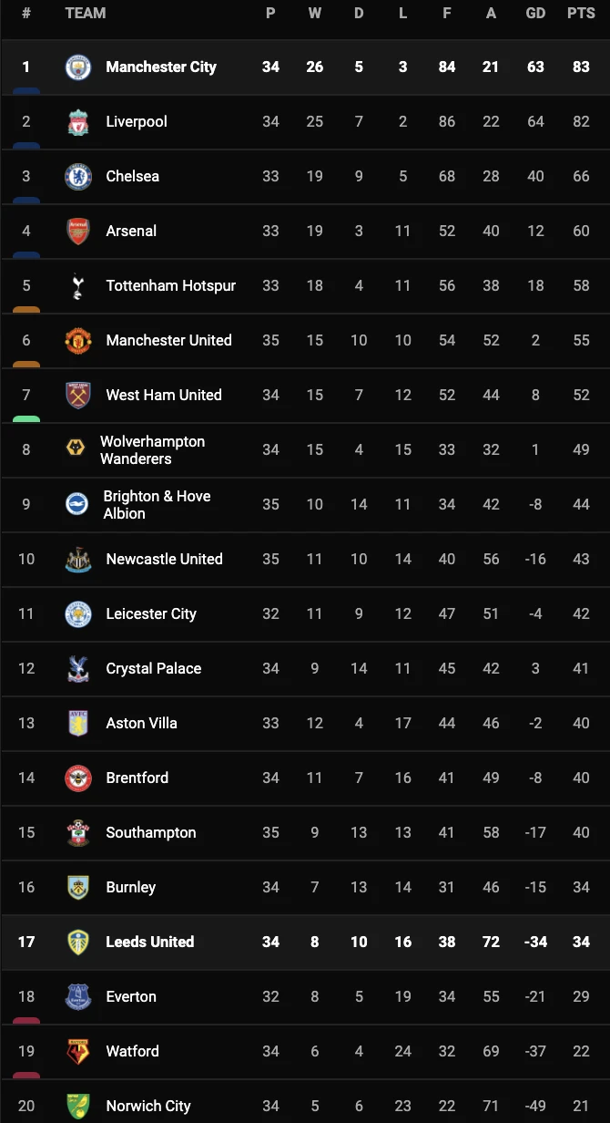 Đại thắng Leeds United 4-0, Manchester City lấy lại ngôi đầu Premier League từ tay Liverpool. Sau 35 vòng đấu, Manchester City dẫn đầu bảng với 83 điểm, hơn Liverpool đúng 1 điểm.