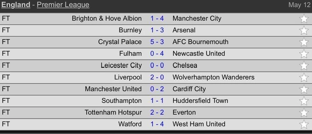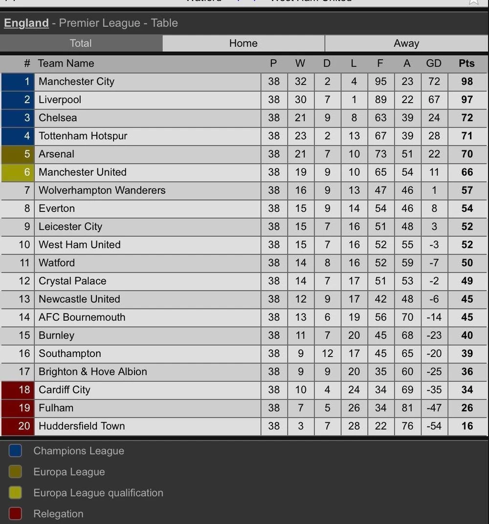 Hai “đại gia” khác phải chơi Europa League là Arsenal xếp hạng 5 với 70 điểm và Man. United xếp hạng 6 với 66 điểm. Trong khi đó ba đội bóng chính thức xuống hạng là Cardiff City, Fulham và Huddersfield Town.