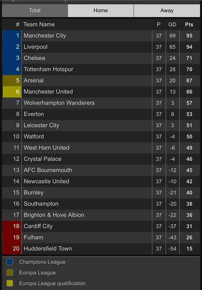 Giành chiến thắng với tỷ số tối thiểu trước Leicester City, Man. City đòi lại vị trí đầu bảng với 95 điểm, hơn đối thủ Liverpool 1 điểm. Trận thắng này đồng nghĩa với việc đội bóng của HLV Pep Guardiola đang chạm một tay vào chức vô địch Premier League năm nay khi ở vòng đấu cuối Man. City chỉ còn đá với Brighton & Hove Albion.