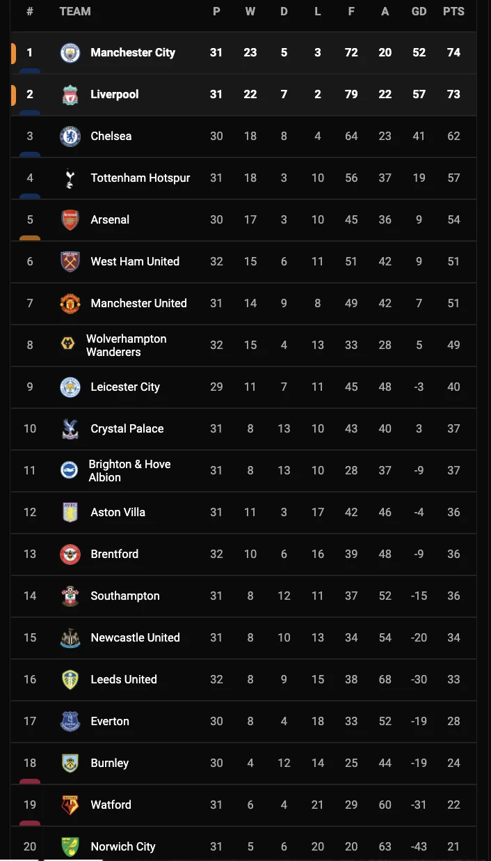 Với kết quả này, cuộc đua vô địch Premier League giữa Manchester City và Liverpool trong 7 vòng đấu còn lại vẫn rất hấp dẫn. Đội bóng của Pep Guardiola tiếp tục giữ ngôi đầu bảng với 74 điểm, hơn đội bóng của Jurgen Klopp 1 điểm.