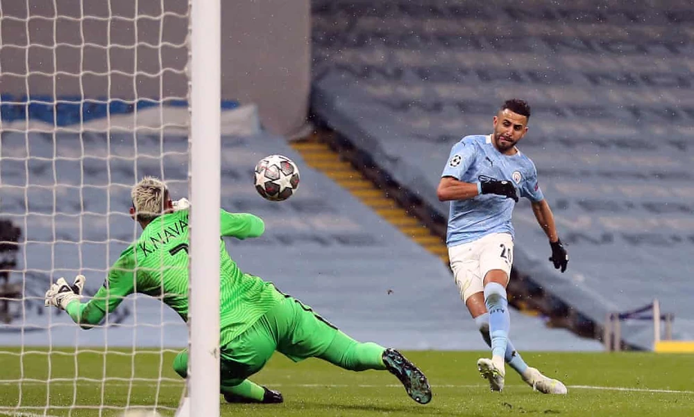 Mahrez dứt điểm cận thành để lập cú đúp, giúp Man. City đánh bại PSG 2-0 ở trận bán kết lượt về. Ảnh: PA.