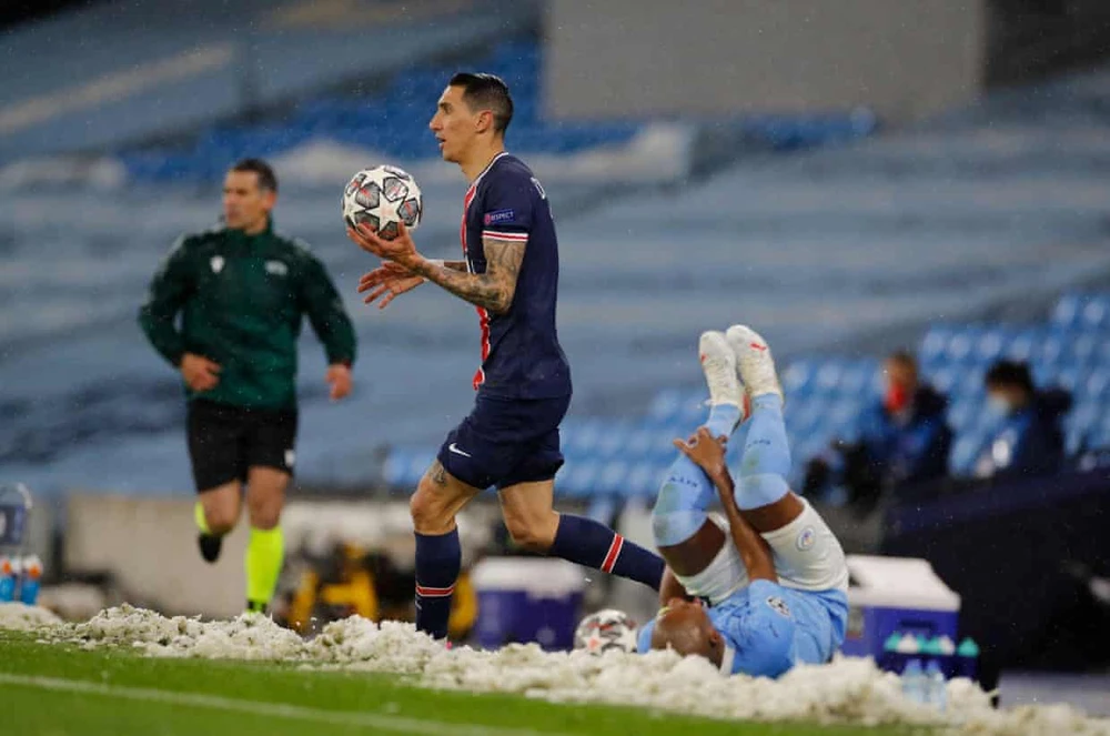 Ngay phút thứ 7, Man. City suýt phải chịu phạt đền khi Di Maria tạt bóng bên cánh trái vào vòng cấm và bóng chạm tay hậu vệ Zinchenko bên phía “Man Xanh”. Mặc dù Kuipers đã chỉ tay vào chấm 11 mét, tuy nhiên tổ VAR lại cho rằng bóng chỉ chạm vai Zinchenko và không cho PSG được hưởng lợi thế.