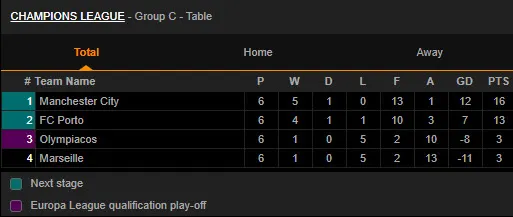 Kết thúc bảng C Champions League, Man City dẫn đầu với 16 điểm, Porto đứng thứ hai có 13 điểm, Marseille và Olympiacos cùng có 3 điểm nhưng Olympiacos đứng thứ ba do hơn đối đầu.