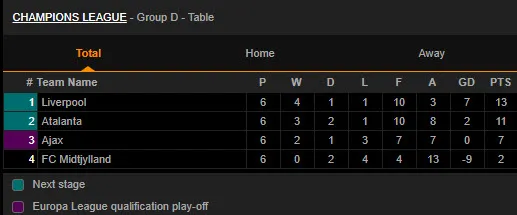 Kết thúc bảng D Champions League, Liverpool (13 điểm) và Atalanta (11 điểm) giành hai suất đi tiếp, Ajax 7 điểm xuống chơi ở Europa League còn Midtjylland có 2 điểm bị loại.