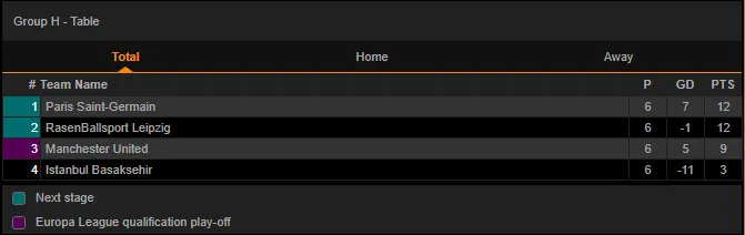 Như vậy sau vòng bảng, PSG và RasenBallsport Leipzig cùng có 12 điểm giành quyền đi tiếp, PSG đứng đầu bảng do hơn đối đầu. Manchester United đứng thứ ba với 9 điểm xuống chơi ở Europa League còn Istanbul Basaksehir xếp cuối bảng với 3 diểm.