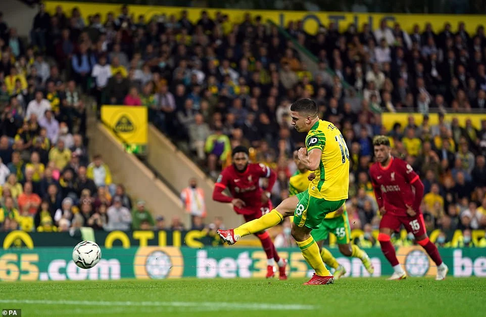 Norwich City có cơ hội gỡ hòa, nhưng Tzolis sút hỏng phạt đền. Ảnh: PA.