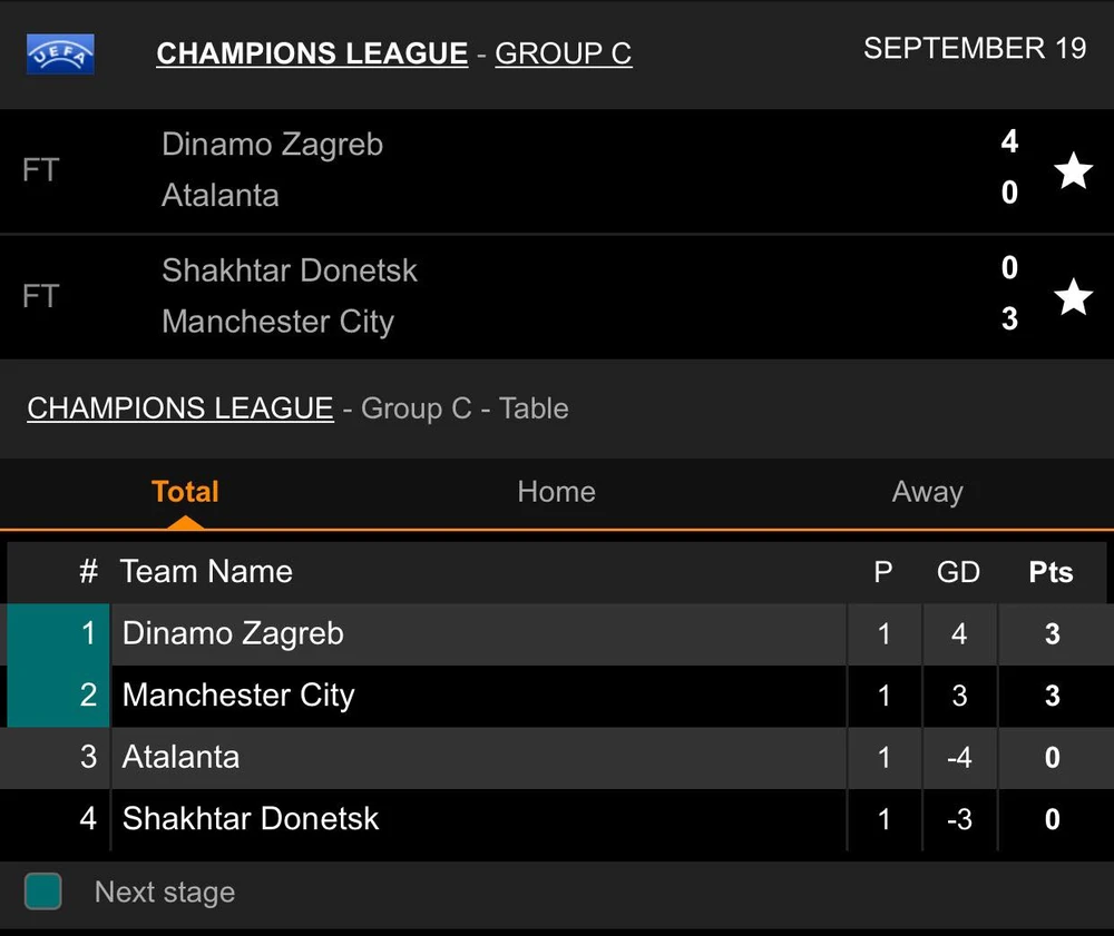 Giành chiến thắng 3-0 trên sân của Sharkhtar Donetsk nhưng thầy trò HLV Pep Guardiola chỉ có được vị trí thứ hai bảng C, bởi ở cặp đấu khác cùng bảng Dinamo Zagreb có được chiến thắng hủy diệt đại diện đến từ Ý là Atalanta với tỷ số 4-0 qua đó chiếm được ngôi đầu bảng.