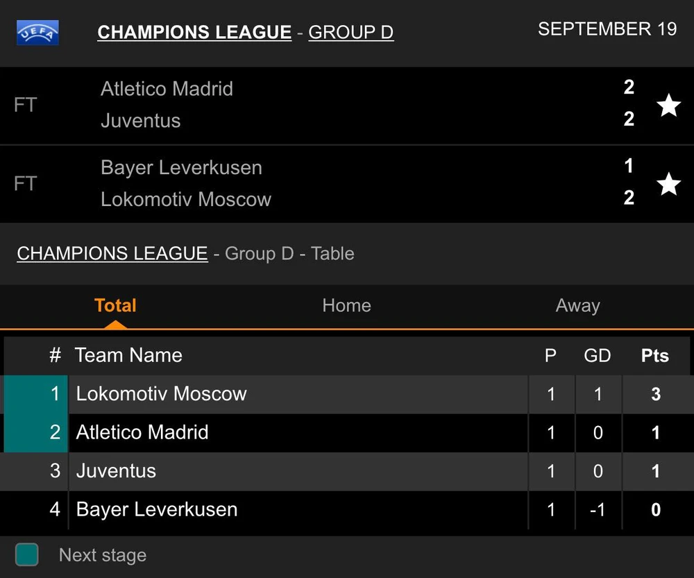 Cặp đấu còn lại, Lokomotiv Moscow có chiến thắng 2-1 trong chuyến làm khách đến sân của Bayer Leverkusen, giúp đại diện của nước Nga giành ngôi đầu bảng D với 3 điểm.