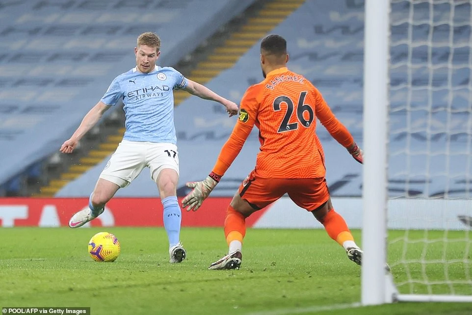 De Bruyne dứt điểm góc hẹp nhưng không mang về bàn thắng cho "Man Xanh". Ảnh: Getty Images.