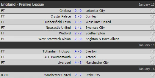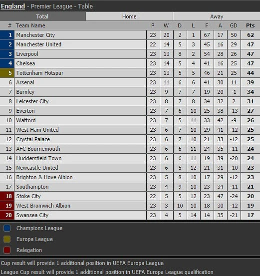 Đối với thầy trò HLV Pep Guardiola, trận thua đầu tiên ở Premier League mùa này không ảnh hưởng quá lớn đến Man City khi họ vẫn hơn 3 đội xếp sau đến 15 điểm trên bảng xếp hạng. Nếu thắng Stoke City trong trận đấu muộn rạng sáng mai (16/1), Man Utd sẽ rút ngắn khoảng cách với Man City xuống còn 12 điểm.