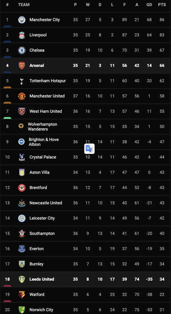 Ở trận đấu khác, Arsenal giành chiến thắng 2-1 trước Leeds United trên sân nhà Emirates, đẩy đối thủ rơi vào nhóm rớt hạng với vị trí thứ 18. Chỉ trong 10 phút đầu tiên, Nketiah ghi liền hai bàn giúp Arsenal vượt lên dẫn 2-0.