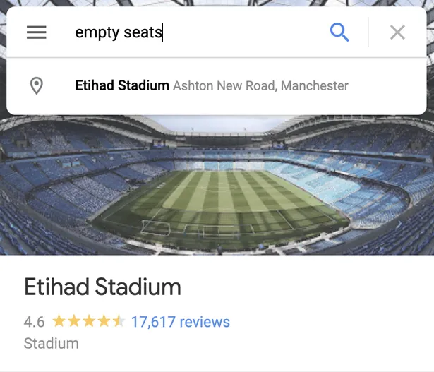 Theo Mirror (Anh), Man City đã tự nhận mình là nạn nhân của Google Maps như xát muối vào vết thương của họ. Khi người dùng tìm kiếm cụm từ “ghế trống” trong nền tảng Google Maps, kết quả trả về là sân vận động Etihad của Man City.