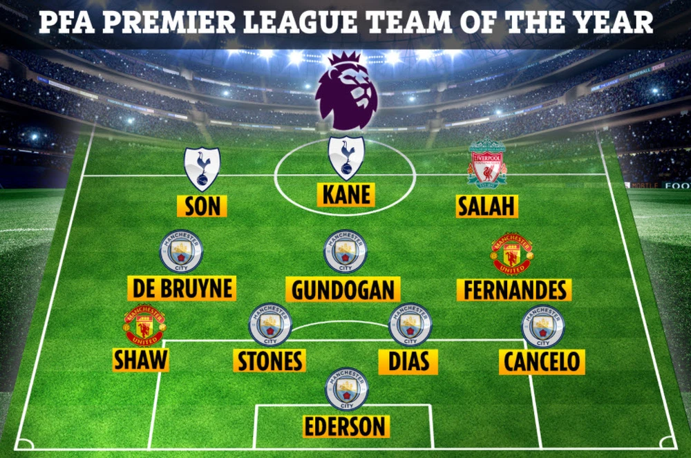Đội hình xuất sắc nhất năm của PFA: Ederson (Man City); Cancelo (Man City), Stones (Man City), Dias (Man City), Shaw (Man Utd); De Bruyne (Man City), Gundogan (Man City), Fernandes (Man Utd); Salah (Liverpool), Kane (Spurs), Son (Tottenham).