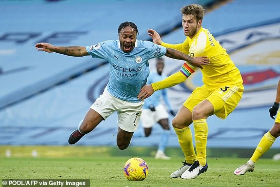 Đội khách hầu như không lên được bóng và chịu áp lực cực lớn từ những pha tấn công liên tục của Man City. Đến phút 25, Sterling có pha xử lý khéo léo khiến hậu vệ Andersen phạm lỗi cài chân trong vòng cấm và trọng tài ngay lập tức chỉ tay vào chấm 11m.