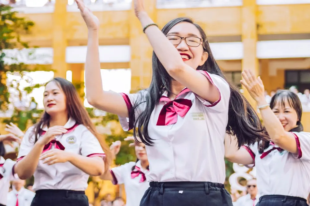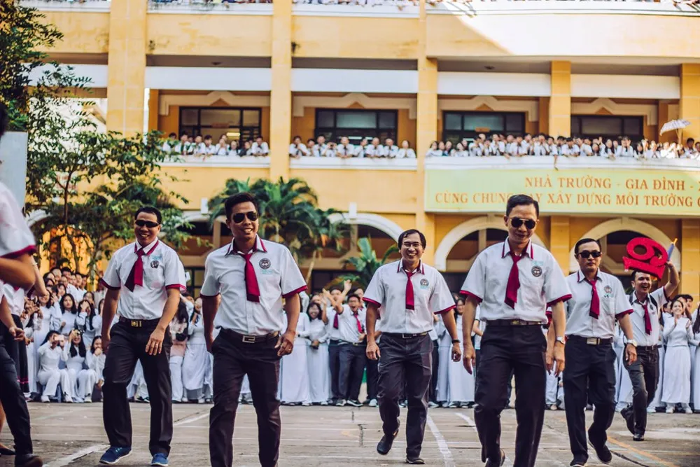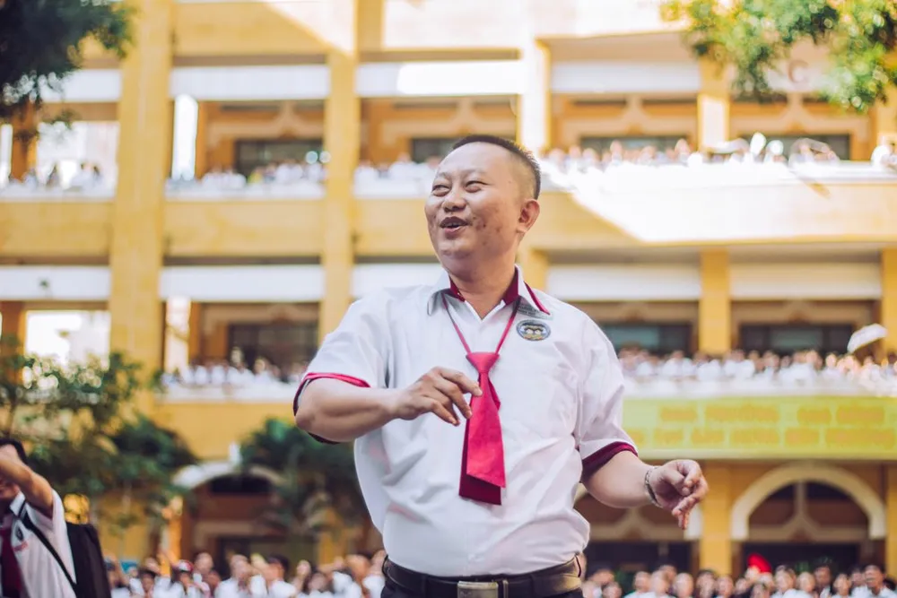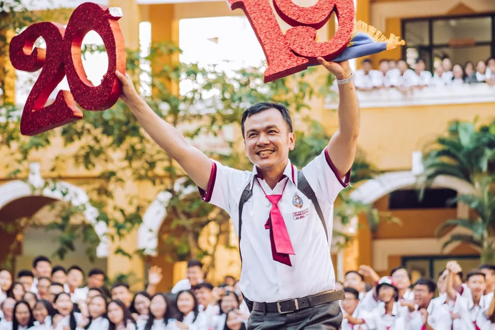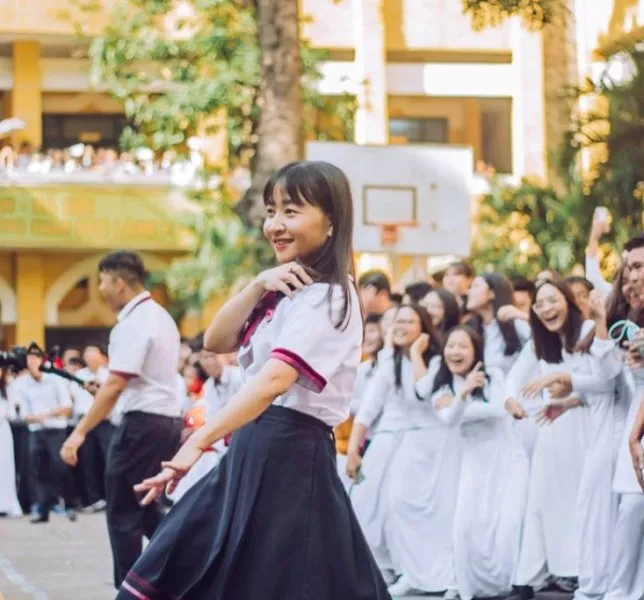 Các thầy cô giáo xuất hiện trong sự ngỡ ngàng của học trò với đồng phục vô cùng dễ thương của học sinh Trưng Vương. Ảnh: NTCC