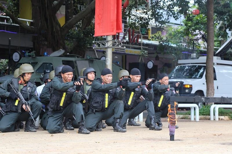 Cảnh sát vượt nguy hiểm giải cứu con tin bị bọn khủng bố bắt trong tình huống giả định.
